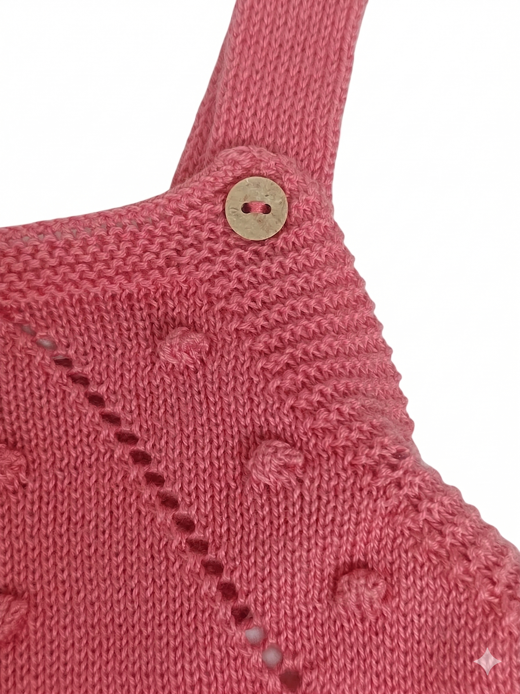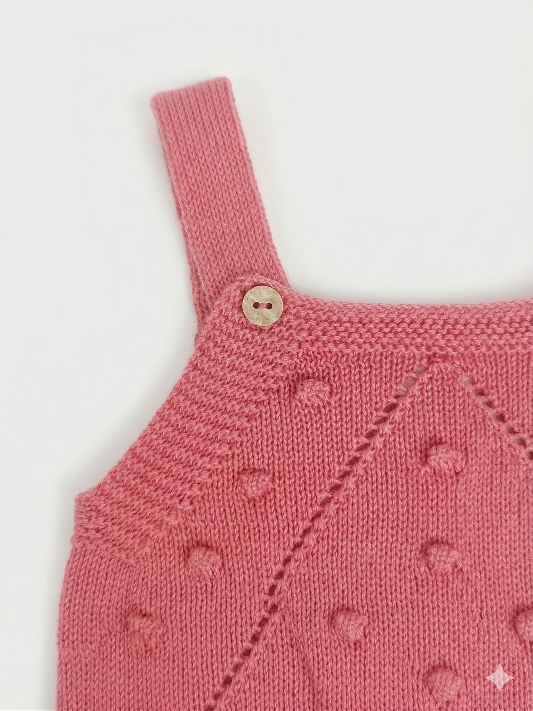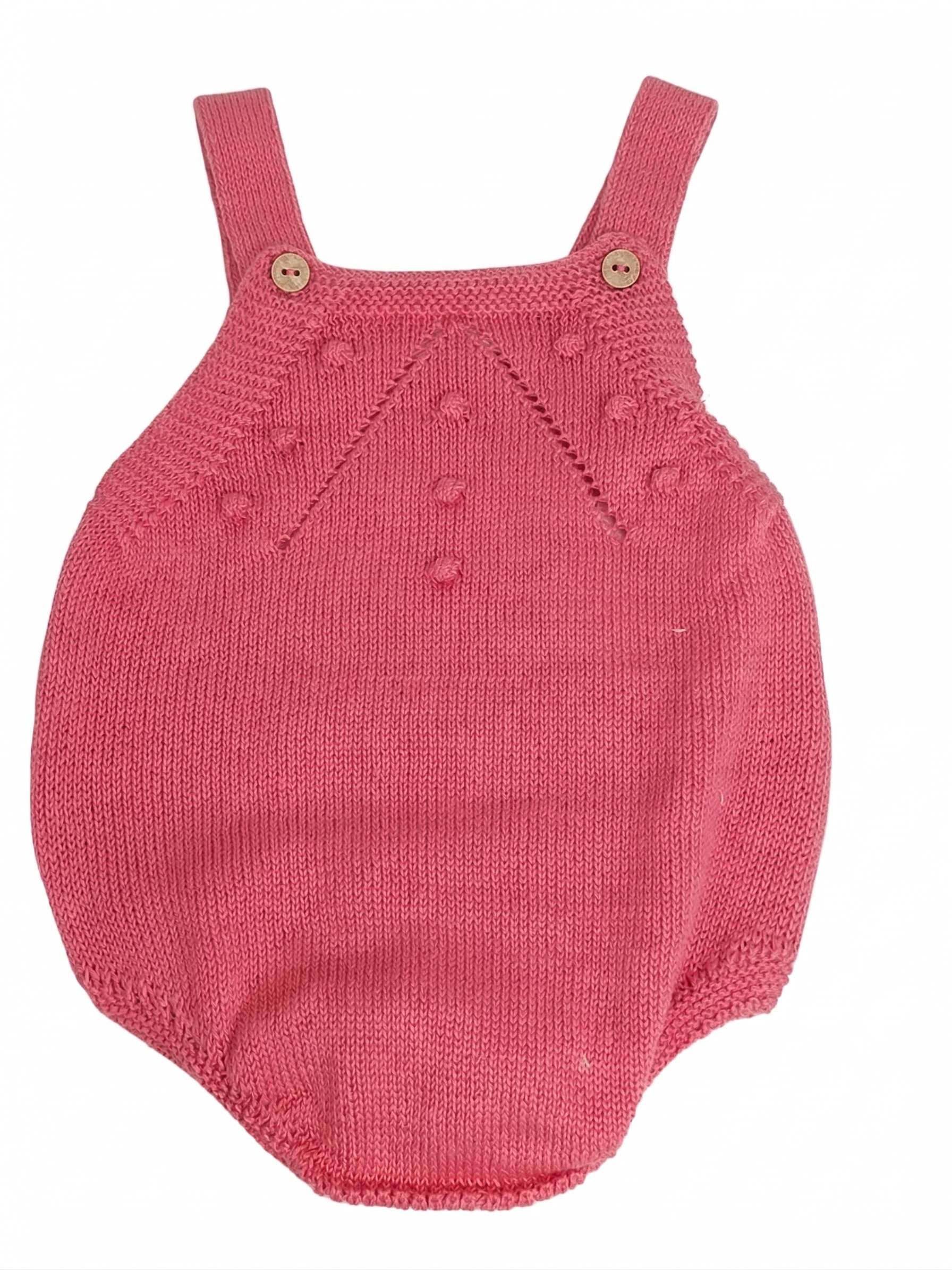 Su diseño presenta un elegante patrón de calados en forma de V en el pecho, adornado con sutiles motas de punto que le dan una textura única y encantadora. Los botones de madera natural en los tirantes y en la entrepierna no solo aportan un toque orgánico y rústico, sino que facilitan el cambio de pañal y el vestido diario.